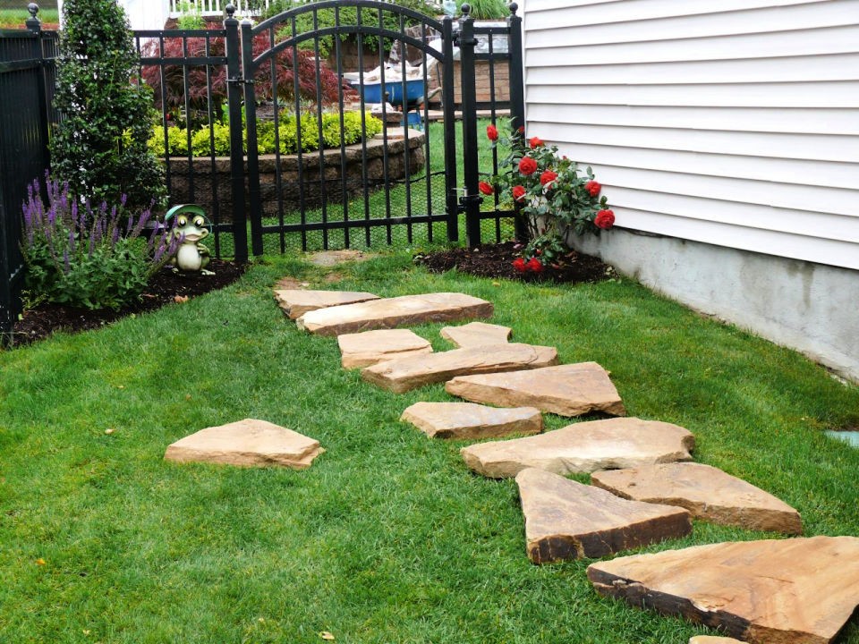 Here, a winding path is created using large, irregularly shaped, naturally colored flagstones laid directly on the grass leading up to a decorative metal garden gate. The stones have a rustic, earthy tone—a mix of browns and tans—and their varying sizes and organic shapes mimic a path that has been there for ages.