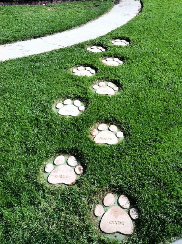 A touching and personalized path is shown here, made up of multiple stepping stones shaped like large dog paw prints, each one slightly sunken into the lush green grass. Many of the prints have the name of a beloved pet, like “CLYDE” and “TURNER,” deeply inscribed into the surface.