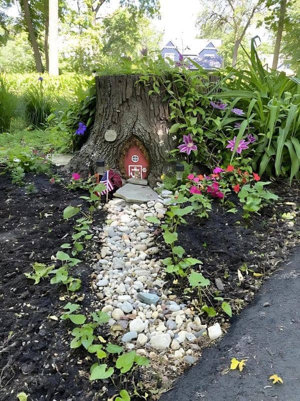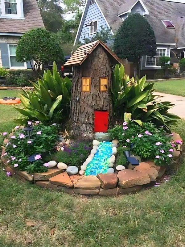 Set within a neatly edged, raised stone garden bed, this design provides a striking focal point for a front yard. A tree stump has been converted into a cottage with a vibrant red door and warm yellow windows, flanked by lush green plants. The real magic is the turquoise blue river of glass pebbles that flows out from the base of the stump and is beautifully contained by the surrounding stones.