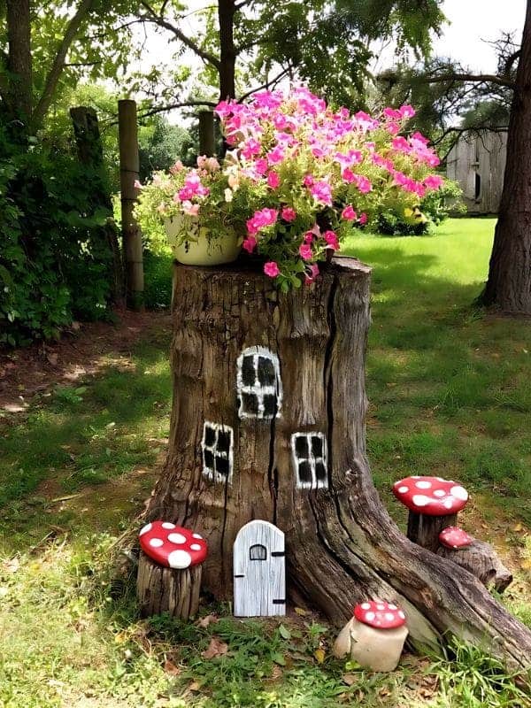 This charming setup uses an old, weathered tree stump as a natural, integrated planter and home. The stump itself features whimsical, hand-painted white doors and windows, giving it a playful, storybook cartoon appearance.