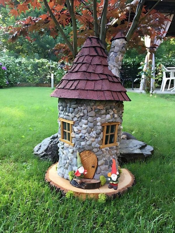 If you love a sturdy, classic look, this circular dwelling is perfect. It features a rotund miniature house with walls completely covered in smooth, gray river stones, topped by a reddish-brown conical roof. The whole structure is firmly anchored on a large, flat wooden log slice, surrounded by soft lawn and two adorable gnomes standing guard.