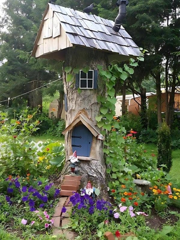 This stunning design utilizes a tall, dead tree stump, transforming it into a towering, multi-level dwelling with a chimney and a shingled roof. A winding vine gracefully climbs the bark, leading the eye up toward the dark-shuttered window and the tiny blue front door that includes its own miniature porch roof.