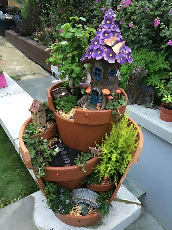 Here is a brilliant way to build a complex, multi-layered environment using a stack of broken or cleverly angled terracotta pots. This design creates a miniature, cascading hillside garden complete with multiple levels, pathways, bridges, and tiny distinct planting areas. The centerpiece is a fairy house with a stunning purple, scallop-shingled roof and a butterfly accent, immediately drawing the eye.