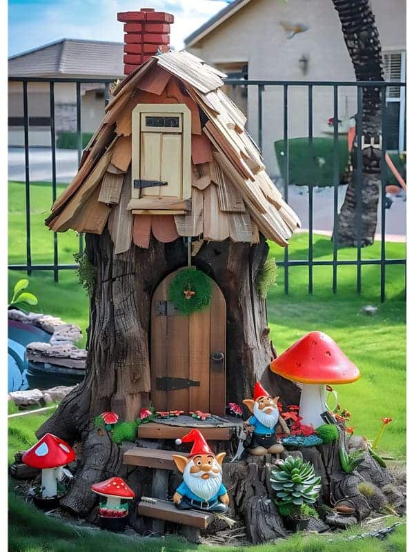 This arrangement is visually striking because the large, natural textures of the stump and the huge mushroom statues are balanced by the small, precise details of the cottage and gnomes. It evokes a classic fairy tale, woodsy wonder, and a very warm, welcoming feeling.
