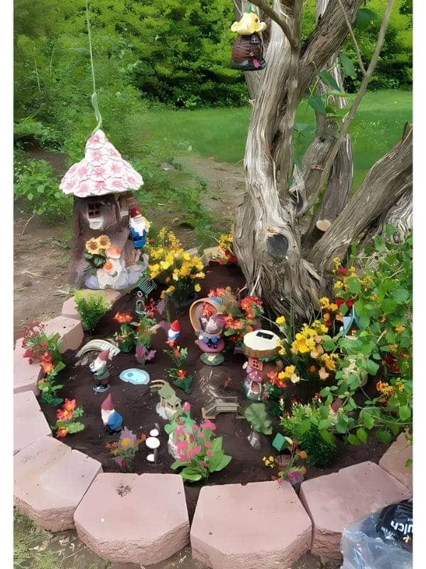 This idea uses a raised, hexagonal border to define a vibrant $\text{gnome garden}$ within an established flower bed around a gnarly old tree. The scene is bursting with miniature details, including tiny houses built into the tree trunk, small ponds, and an abundance of colorful flowers (yellows, reds, and pinks).