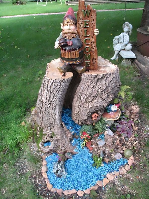 This amazing $\text{gnome garden}$ centers around a creatively repurposed tree stump, turning a yard remnant into a vibrant waterscape. A large, welcoming gnome figure stands atop the stump, which has been carved out to form a stunning miniature waterfall and stream bed. The stream is represented beautifully by bright blue, tumbled glass stones, creating the illusion of moving water leading into a rocky pool.