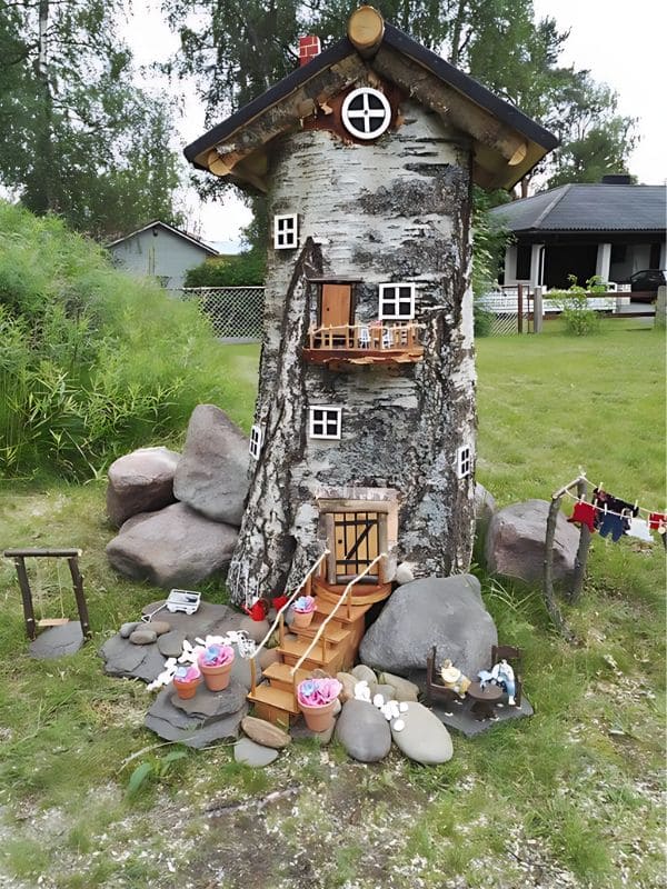 This sophisticated design proves that a $\text{gnome garden}$ can be grand! It features a magnificent multi-story miniature house constructed entirely out of natural birch bark, giving it a wonderfully rustic and authentic tower appearance. Miniature staircases lead up to the front door, and a tiny balcony is perched high up for a perfect view of the garden.