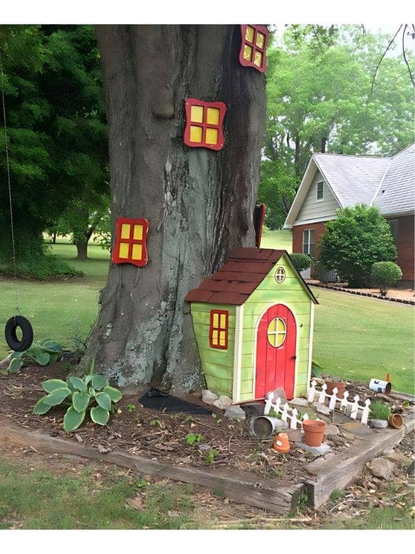 This fun, brightly colored installation uses a large tree trunk as a vertical backdrop for a separate, freestanding gnome house. The little green and red cottage sits nestled at the base, complete with a tiny white picket fence and small pots, while oversized, colorful windows are mounted higher up on the tree itself.