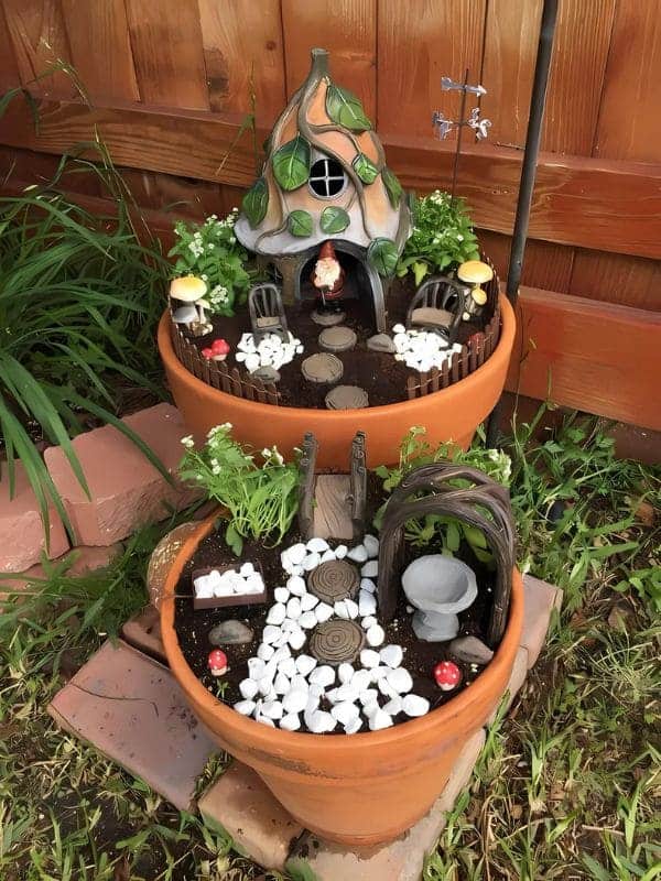 This is such a clever idea for small spaces, using two terracotta pots stacked to create a multi-level $\text{gnome garden}$ with distinct zones. The top pot holds a charming, dome-shaped house with a leafy roof and a welcoming gnome standing at the entrance, surrounded by sweet little white chairs and small mushrooms.