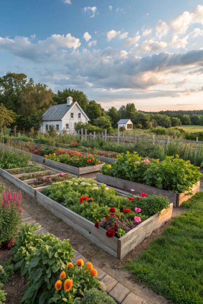 Visually, the composition is stunning because the soft evening light highlights the varied textures of the plantings, making the garden feel incredibly abundant and established. It captures a peaceful, slightly wild, and deeply romantic cottagecore energy. This layout suggests a slower pace of life, combining ornamental beauty with practical food production effortlessly. You can achieve this look by letting flowers spill over the edges of your veggie beds and choosing weathered wood for a timeless, rustic feel.