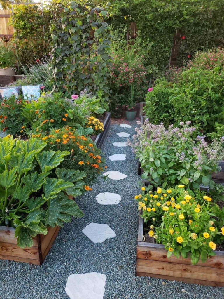 A lush, overflowing garden is pictured here with two large, timber raised beds flanking a simple pathway of loose, blue-gray gravel, punctuated by a series of irregular, light-colored stepping stones. The beds are densely planted with a vibrant mix of vegetables, like large squash plants, and colorful flowers such as marigolds. The background is a dense wall of greenery, providing a lovely, private enclosure.