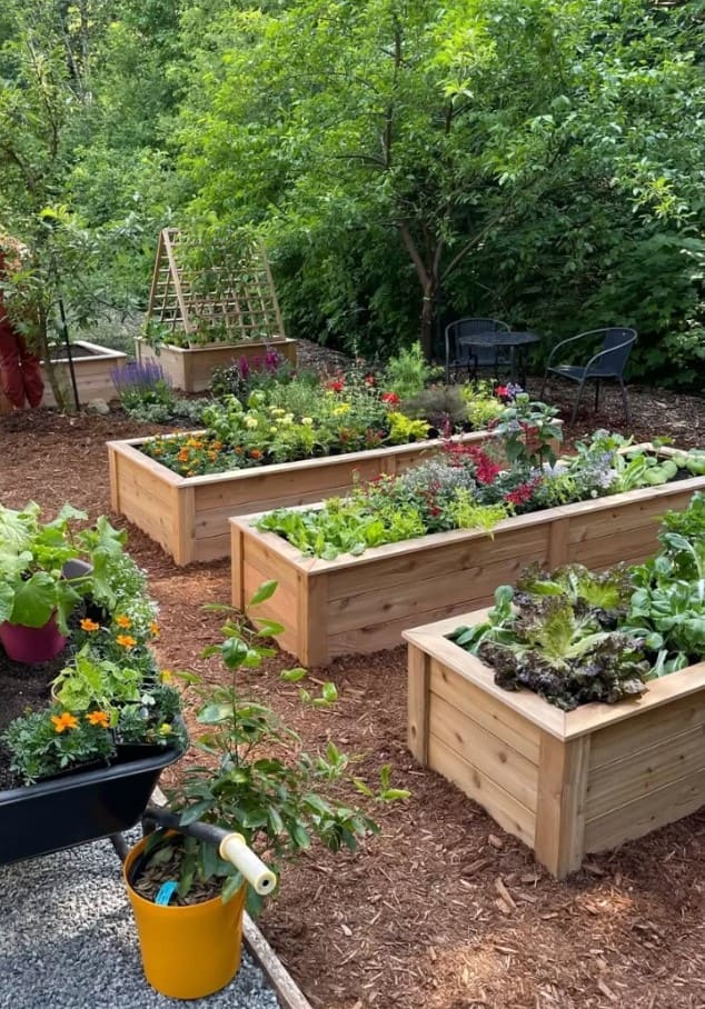 This garden showcases several long, natural wood raised beds, nestled beautifully among mature trees and surrounded by a soft, reddish-brown mulch or wood chip path. The beds are full of a mix of colorful flowers and various greens, suggesting a dedication to companion planting and biodiversity. A small, cozy seating area with dark chairs is visible in the background, offering a retreat spot.