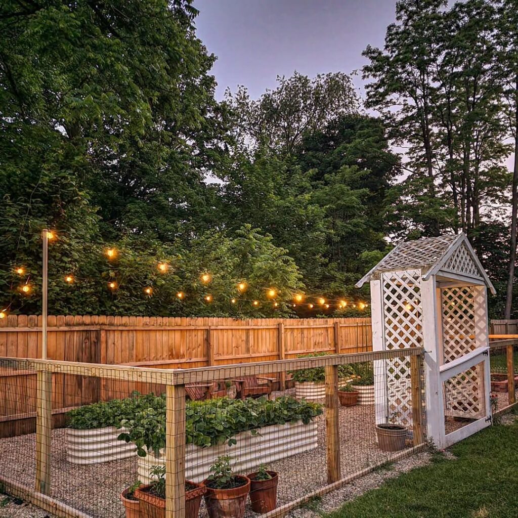 This charming small garden is enclosed by a secure wooden fence and features several sleek, metal raised beds filled with crops, illuminated by a string of warm, glowing market lights overhead. A simple, netted fence enclosure provides protection for the beds, and a white lattice gate adds a decorative entrance feature. The ground is covered in light gravel, creating a soft, clean base layer.