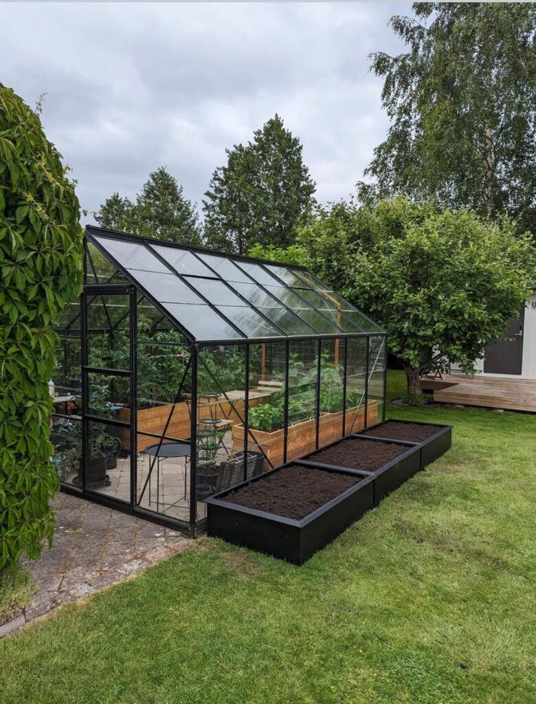 A sleek, black-framed glass greenhouse stands as the centerpiece in this tidy lawn setting, flanked by several long, low black planters ready for planting outside. Inside the greenhouse, timber raised beds are already established, demonstrating year-round growth capability. The area outside is a mix of paving stones near the structure and immaculate green lawn.