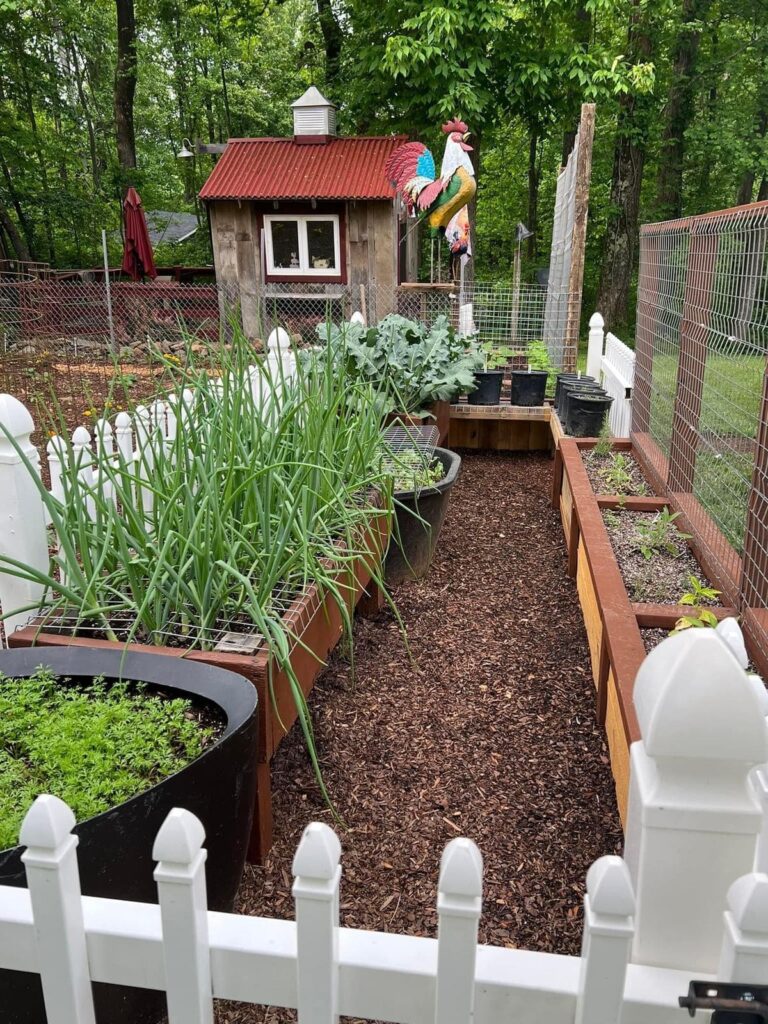 This charming, slightly eclectic garden features a mix of raised wooden beds and large planters filled with tall onions and other veggies, all enclosed by a neat white picket fence. A rustic wooden shed with a bright red metal roof and a whimsical rooster decoration sits in the background, adding personality. The pathway is covered in a deep layer of reddish-brown wood chip mulch.