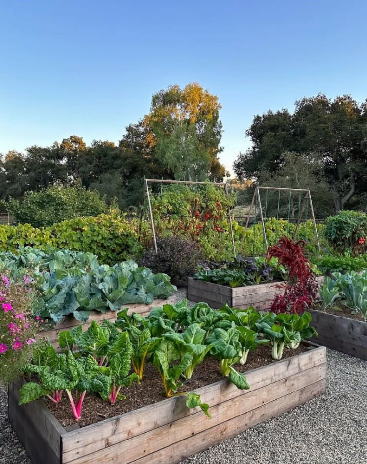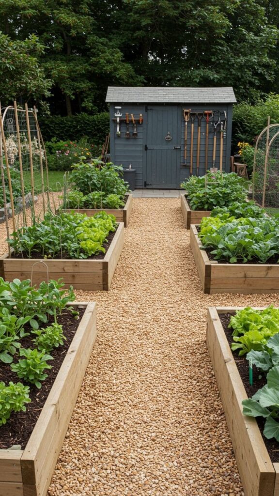 The design works so well because the crisp lines of the wooden beds contrast beautifully with the warm, golden pea gravel, which prevents weeds and keeps the area tidy. The clear, structured layout makes harvesting and maintenance incredibly simple, as you can reach any spot easily. It creates a mood of organized productivity and serene order, proving that a working garden can be incredibly chic and inviting. To recreate this vibe, focus on building uniform raised beds and choosing a light-colored, fine gravel for the walking areas.