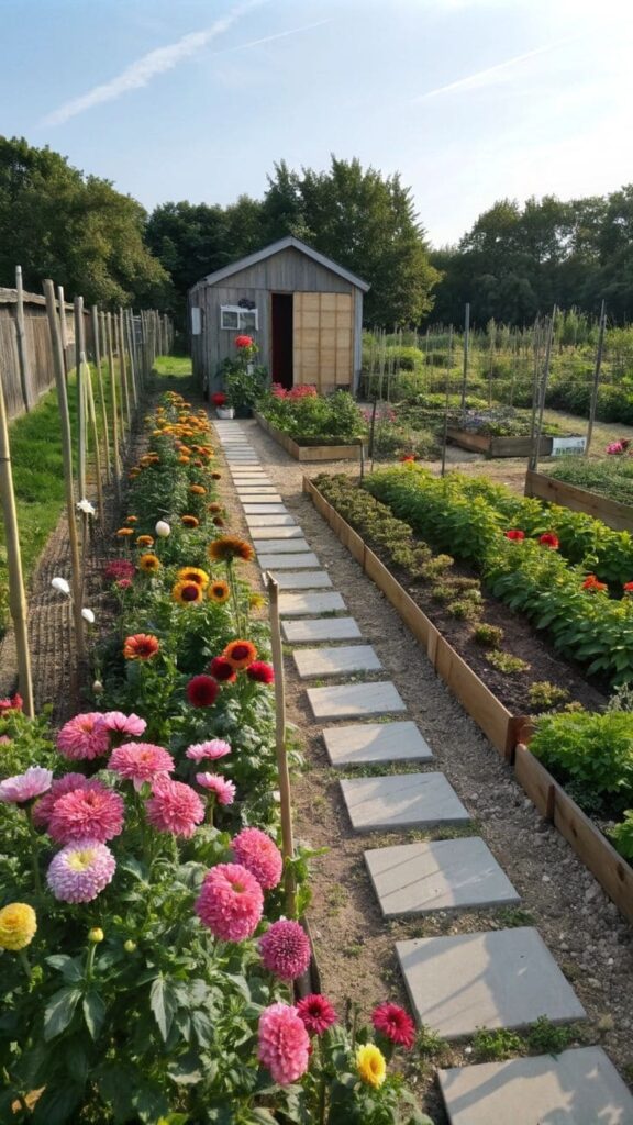 This beautiful layout features a long, straight path that runs directly to a rustic wooden shed in the distance, flanked by a generous border of vibrant flowers on one side and organized raised beds on the other. The pathway is a mix of light-colored gravel punctuated by clean, rectangular stepping stones that give it a contemporary feel. The dahlias and other blooms create a stunning, colorful focal wall that contrasts with the neat rows of vegetables.
