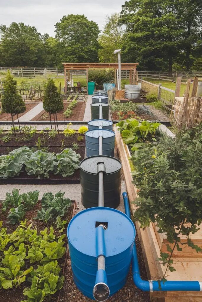 The design beautifully integrates necessary infrastructure (water storage) into the garden layout, proving that utility can still be orderly and effective. The clean lines of the beds contrast with the large, round, colorful barrels, creating a powerful, working-farm aesthetic. This setup conveys a mood of serious sustainability and thoughtful resource management. If you’re serious about water conservation, placing your catchment system close to your growing zone makes irrigation far easier and more efficient.