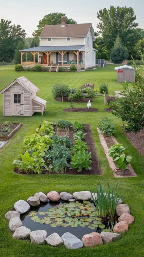 This expansive yard integrates a home, several outbuildings, and a garden plot into one cohesive, beautiful landscape, notably featuring a small, informal pond ringed with natural stones in the foreground. The vegetable beds are neatly tucked into the lawn with dark mulch paths, and a small potting shed and chicken coop sit further back, framed by open green space.