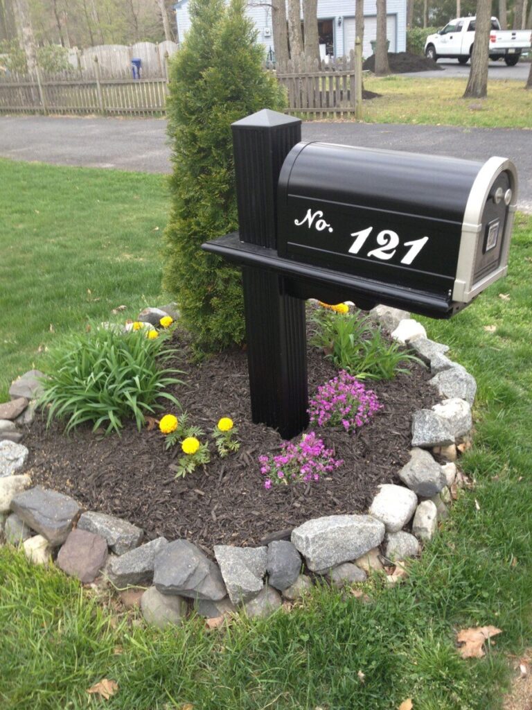 Sometimes, the best landscaping idea is the simplest one that offers great structure and contrast. This design uses the classic pairing of black and green to create a timeless, manicured look. The solid black post and mailbox are perfectly grounded by the ring of rough, natural fieldstones.