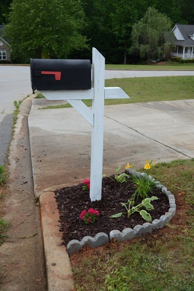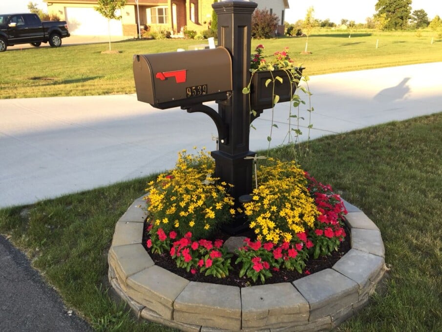 This is such a polished, sturdy look! Creating a raised bed with stacked, interlocking retaining wall stones gives the mailbox area a professional, custom-built feel that adds significant value to your home’s appearance. The slight curve of the stone wall is very softening and inviting.