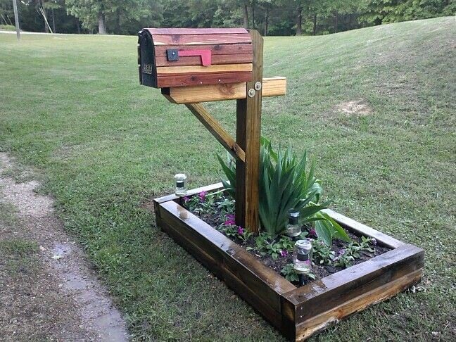 The moment I saw this, I thought, “This is the perfect way to add height and drama without a lot of digging!” Using a stained wooden raised bed around the post gives this mailbox an immediate sense of intention and craftsmanship. It looks so warm and inviting, especially with the rich, multi-toned wood of the actual mailbox.