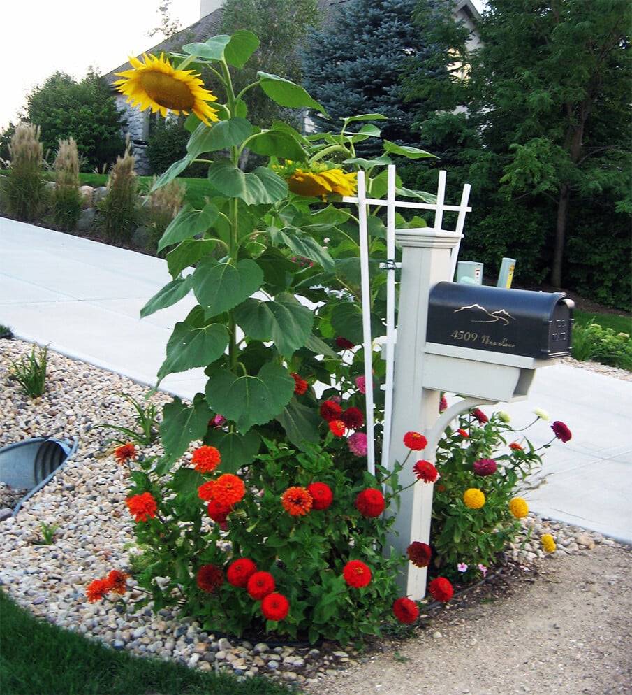 Pairing the massive sunflowers with bright red and orange zinnias creates such a lively contrast against the white post and dark mailbox. The gravel base is a practical choice, providing excellent drainage and keeping weeds down, which is a big plus. If you live in an area with a lot of sun, this is an absolute must-try. Just imagine the butterflies and bees this beautiful, natural beacon would attract. It’s like a mini pollinator paradise right by the street!