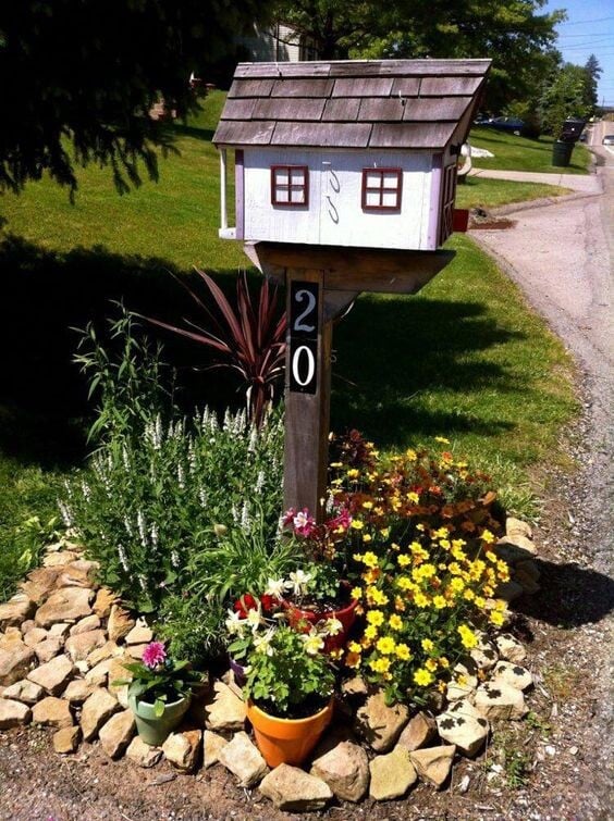 This is the sweetest setup! The little house mailbox, complete with tiny windows and a shingled roof, has so much personality—it truly feels like a miniature home for your mail. This look is perfect for those who lean into the cottagecore aesthetic or just adore whimsical, storybook charm in their garden.