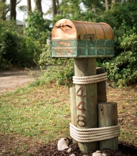 I absolutely fell head over heels for this look! It instantly transports me to a breezy, oceanside cottage, even if I’m miles from the coast. The combination of the weathered copper mailbox, complete with that stunning verdigris patina, paired with the chunky wooden posts and thick nautical rope is just genius. It has such a masculine, yet inviting, texture.