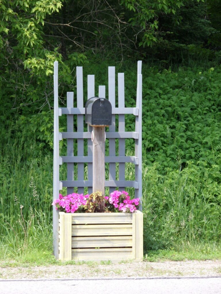 This idea is both beautiful and brilliant for creating a sense of enclosure and privacy. The grey-painted vertical lattice screen acts as a wonderful backdrop, instantly drawing the eye to the mailbox and giving the entire area a finished, custom-built look. It’s a stylish way to add height when you don’t want tall plants.