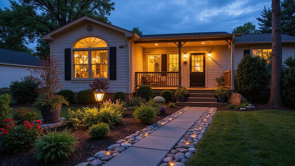 This nighttime view shows a beautiful transformation, with the mobile home façade glowing warmly from interior and exterior lighting. A simple concrete walkway is dramatically lit by small pebble-lined fairy lights, and a lantern illuminates the lush foundation plantings around the porch. The contrasting dark shutters and door against the light siding create a sophisticated, welcoming look.