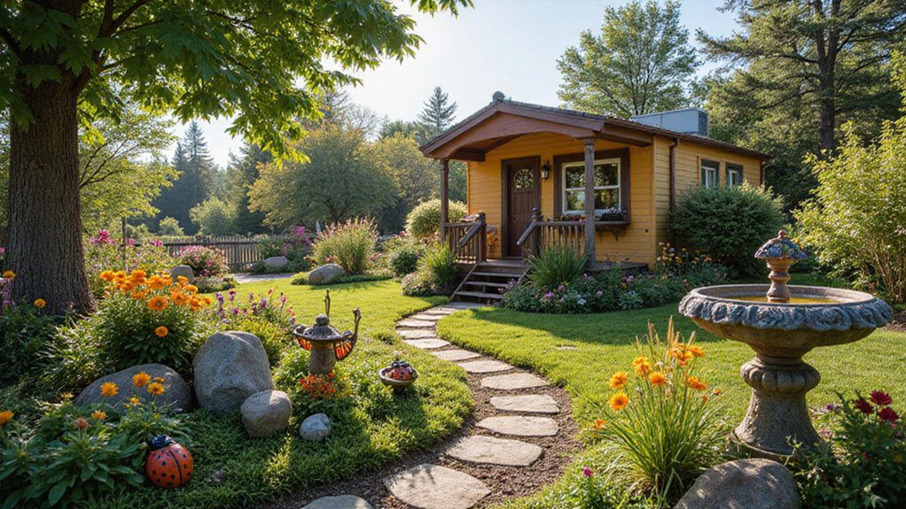 This cozy yellow mobile home, nestled in a deeply wooded setting, is complemented by a whimsical garden featuring large rocks, stepping stones, and a decorative pedestal fountain. The yard is a mix of manicured lawn and lush, flowering beds. Playful garden ornaments, like large painted ladybugs, enhance the sweet, storybook feel of the space.