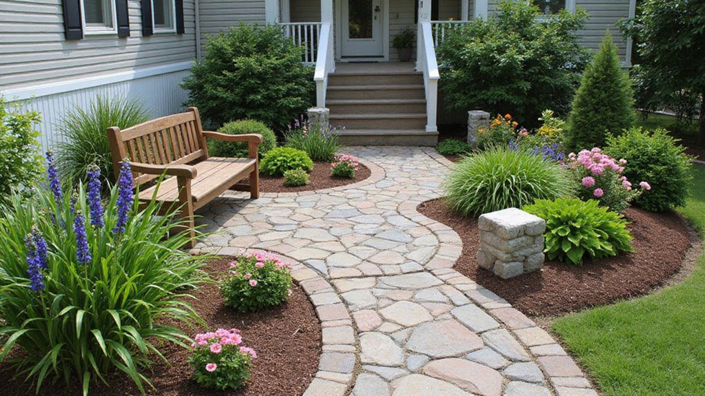 Here, the focus is on a magnificent, serpentine walkway made of intricately patterned flagstone pavers, bordered by a neat row of brick-like edging. The curved path leads directly to the front steps and a beautifully placed wooden bench, offering a perfect spot to pause. The garden beds on either side are generously planted with purple spikes, pink shrubs, and lush hostas, all set in rich, dark mulch.