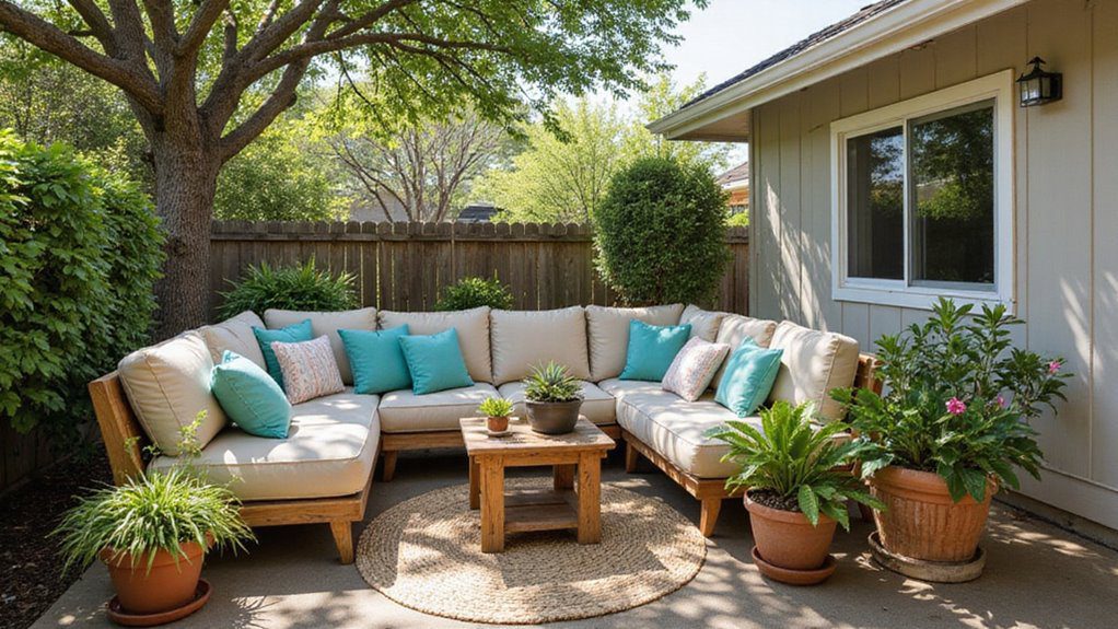Here we see an inviting outdoor living space carved out right beside the home, featuring a large, U-shaped sectional with thick, neutral cushions and bright turquoise and patterned throw pillows. Potted plants add life and texture around the perimeter, and a simple wooden coffee table sits atop a circular woven rug, grounding the whole arrangement. A tall, established tree provides natural shade over the patio.
