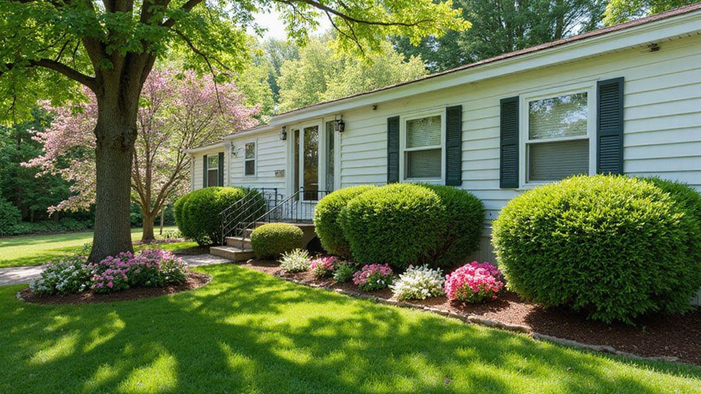 The visual impact is one of stability and traditional elegance. The uniform height and shape of the shrubs provide a sense of structure and balance that is particularly grounding for a mobile home design. It avoids an overly busy look by focusing on rich green textures rather than too many colorful flowers. To achieve this level of neatness, prioritize foundation plantings like boxwoods and ensure you keep them regularly trimmed into pleasing shapes.