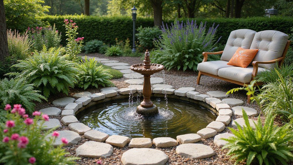 This close-up focuses on a lovely, serene sitting area anchored by a small, tiered fountain set in a perfectly circular, river stone-lined pool. A comfortable love seat with a patterned orange pillow sits nearby on a bed of gravel, surrounded by ferns, hostas, and lavender-colored shrubs. A stepping stone path leads subtly into the space.