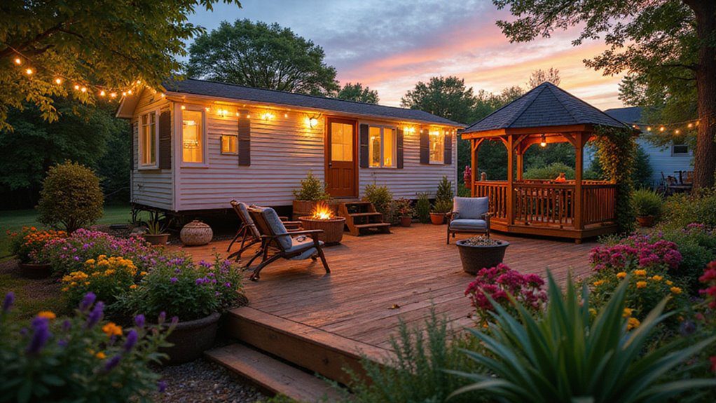 This evening view captures the pure magic of outdoor lighting around a mobile home and its integrated wooden deck. String lights drape gracefully over the home and surrounding trees, highlighting a charming separate wooden gazebo and a nearby fire pit area. The landscaping glows with purple and pink flowers, making the entire space feel like an outdoor party.