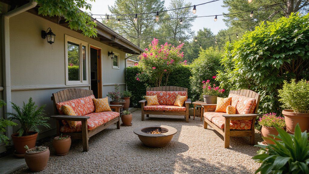 This inviting outdoor sitting area features a simple crushed stone patio floor, anchored by a low, circular fire bowl. Wooden garden furniture with bright, custom orange and patterned cushions creates a vibrant contrast against the surrounding green hedges and potted plants. String lights are hung overhead, ready for evening enjoyment.