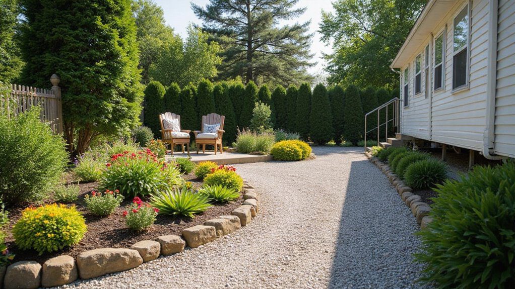 The appeal lies in the contrast between the neat gravel path and the wild, organic shape of the garden beds. The curve of the path is incredibly inviting, drawing your eye back toward the peaceful chairs and table. It creates a serene, forest-like mood that is instantly calming. To recreate this established look, try using a skirt—like the patterned one visible here—to give the mobile home a more grounded, custom foundation.
