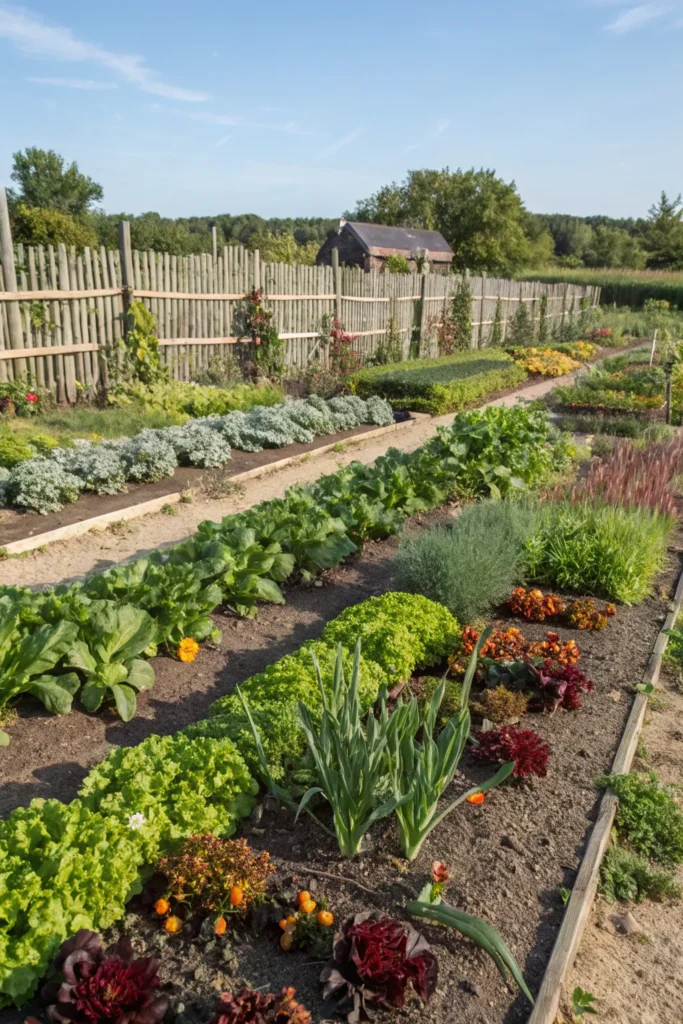 A long, sunlit view shows orderly rows of mixed plantings bordered by a rustic, vertical plank wooden fence that adds a wonderful texture to the background. The potager garden features clean rows of vibrant leafy greens, red lettuce varieties, and companion flowers like marigolds and calendula, all neatly separated by simple dirt pathways. The fence is lightly covered in climbing plants, softening the hard edges and making the boundary feel organic.