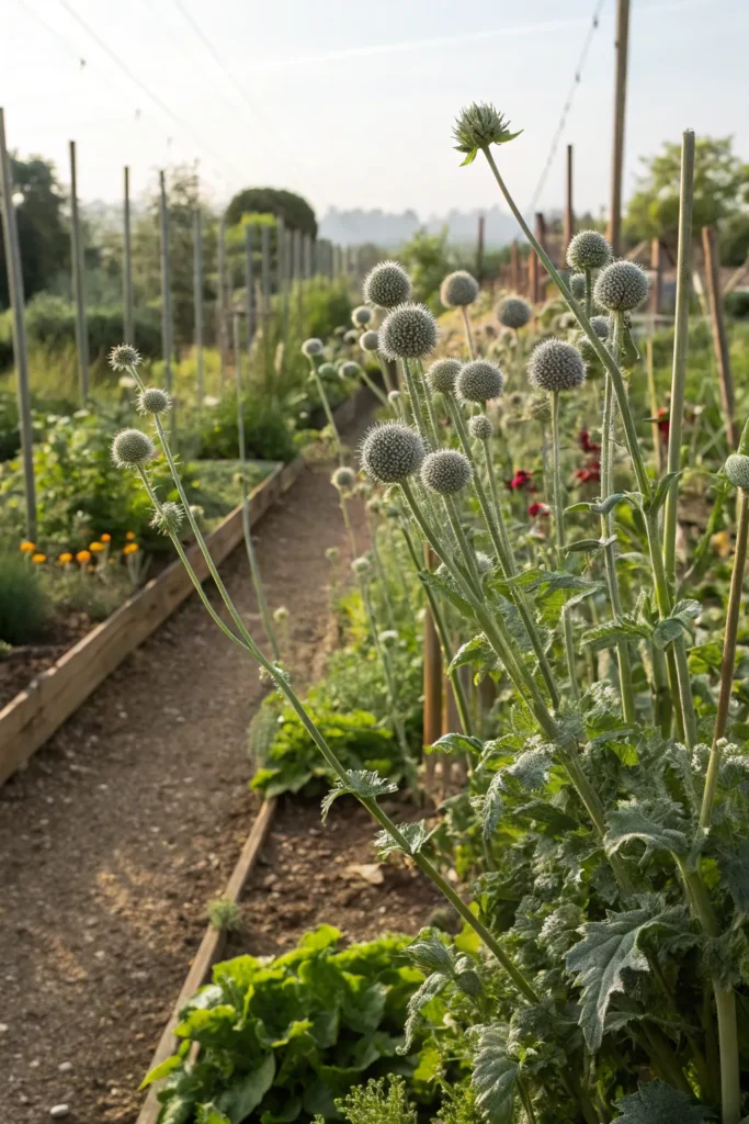 Don’t be afraid to incorporate interesting, textural ornamentals like globe thistles or ornamental grasses into your vegetable beds for a delightful, unexpected visual pop.