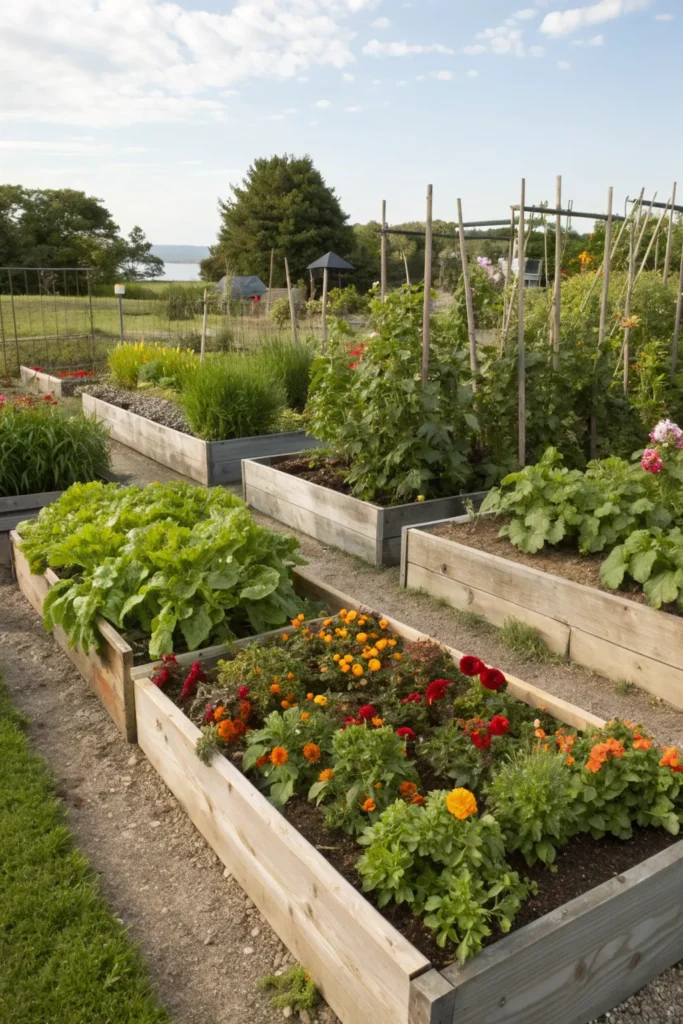 This bright, expansive potager garden scene features several clean-lined wooden raised beds leading toward a lovely, open view of a lake or the ocean in the distance. The foreground bed is filled with a bold mix of yellow and orange flowers and leafy greens, creating a cheerful welcome. The height of the beds is uniform, and tall bamboo stakes are utilized to support climbing plants in the background.