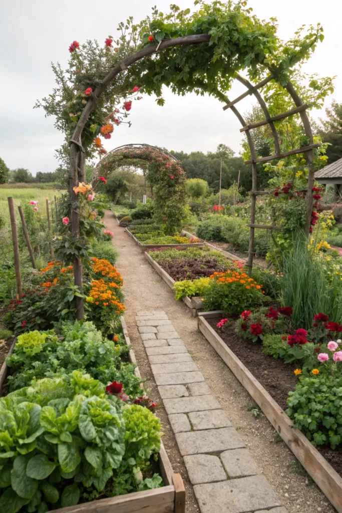 This potager garden features a delightful path leading through a series of stunning wooden archways, draped in climbing roses and vines, creating a captivating tunnel effect. The path itself is laid with charming, irregular stepping stones, guiding the eye between the lush, bountiful raised wooden beds. The beds are a vibrant mix of colorful marigolds, roses, and crisp head lettuce, illustrating the beautiful blending of edibles and ornamentals.