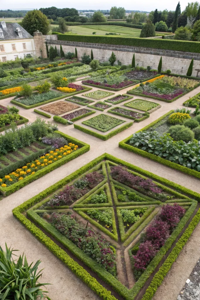 This breathtaking image showcases a highly organized, classic French potager garden characterized by strict geometric symmetry and perfectly manicured hedges. The garden is divided into large, square and diamond-shaped beds, edged with low, precise boxwood borders, creating an intricate parterre design filled with a beautiful mosaic of greens, purples, and yellows. This is set against the backdrop of a grand stone building, emphasizing the scale and formality of the design.