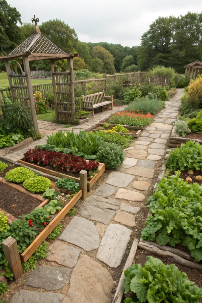 This image showcases a sophisticated potager garden design using large, irregular flagstones to create a wide, meandering pathway between substantial, dark soil beds framed by wood. The garden incorporates a lovely wooden pergola or arbor on the left, with a simple wooden bench nestled against a low fence, encouraging rest and reflection. The beds contain diverse plants, from lush greens to deep red ornamental cabbages, highlighting the decorative potential of food.