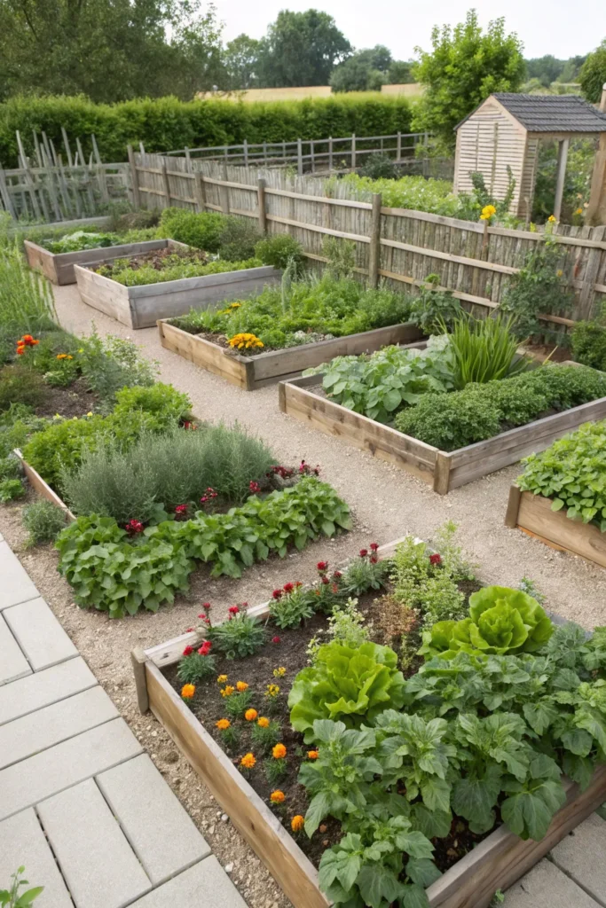 This works so well because the structure is simple—straight lines and repeating shapes—but the planting is lush and soft, offering a beautiful contrast. The vibe is one of organized abundance, suggesting a productive yet perfectly curated countryside life.