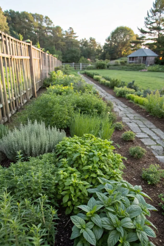 This close-up view focuses on a dense planting of aromatic herbs, including bushy basil and soft, silvery lavender, thriving alongside a path of simple, uneven stone pavers. The herbs are so abundant they spill slightly over the edges, creating a lush, tactile border leading towards a classic, whitewashed picket fence and a distant lawn area.