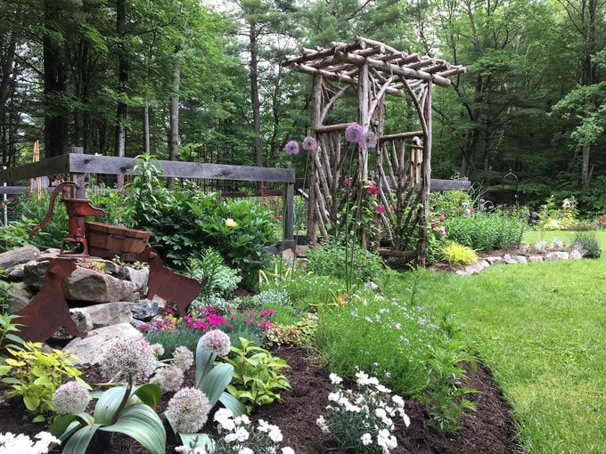 This wider shot reveals a deeply atmospheric garden scene featuring a rustic, handcrafted wooden archway made of natural branches, nestled amongst lush greenery and a charming mix of flowers. A rusty, antique water pump adds a perfect vintage touch near a cluster of large, globe-shaped purple Alliums.