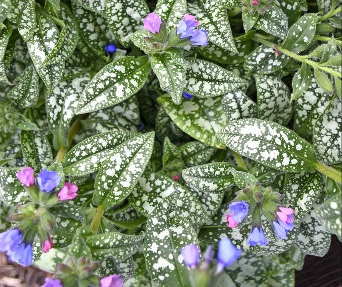 This close-up features the intricate foliage of a plant, likely Pulmonaria (Lungwort), showcasing dark green leaves heavily speckled with silvery-white spots, interspersed with small, clustered flowers in shades of pink and purple-blue. The texture is rough and slightly hairy, adding wonderful dimension.