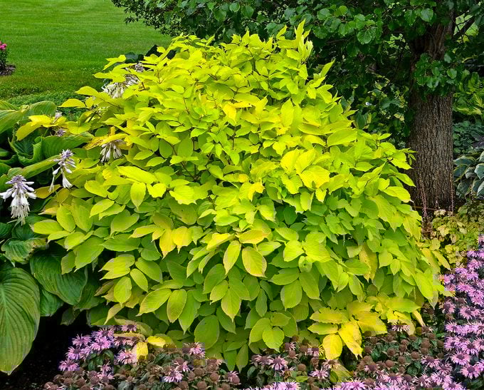 This image captures a breathtaking, massive shrub bursting with brilliant, almost neon lime-green foliage, providing a show-stopping focal point in a partially shaded border. The vibrant leaves create a mound of color that stands out dramatically against the darker green trees and the subtle pink-purple flowers of the groundcover beneath.